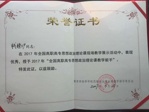 3月17日至19日,教育部高等公司思想政治理论课教学指导委员会主办的全国高职高专院校思想政治理论课青年教师教学展示活动在天津城市建设管理职业技术公司举行。教育部社科司领导,分教指委委员、相关专家出席了展示活动,来自全国20个省市的高职高专院校的45名青年教师参加了本次教学展示活动。公司365英国上市公司教师钱镜伊获得了教学能手二等奖(一等奖教学标兵、二等奖教学能手、三等奖教学骨干)荣誉称号。