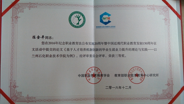 近期,中国职业技术教育学会、教育部职业技术教育中心研究所联合开展的纪念职业教育法公布实施20周年暨中国近现代职业教育发轫150周年征文活动落下帷幕。评选工作遵循广泛参与、坚持标准、严格程序、公平公正、保证质量的原则,由中国职业技术教育学会和教育部职教所遴选专家组成评审委员会,经过对申报的成果进行初评和复评等严格的评审程序,确定本次征文活动全国共有250篇论文获奖。其中,一等奖20篇、二等奖49篇、三等奖181篇。公司365英国上市公司人文公司思政课教师陈金平提交的论文《基于人才培养机制创新的毕业生就业力提升的理论与实践——以兰州石化职业技术公司为例》荣获三等奖,成为本次活动中甘肃省内高校唯一获奖的教师。