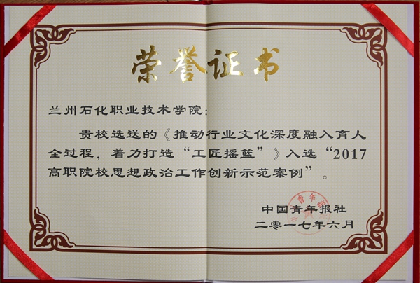 6月6日至8日,由中国青年报社、全国职业院校宣传部长联席会主办的2017高职院校思想政治工作研讨会暨中国青年报、中青在线“融媒小厨”高级研修班在京召开,教育部思政司、团中央公司部、中国高等教育学会等相关领导出席会议。全国近百所高职院校应邀参会。公司党委宣传部报送的《推动行业文化深度融入育人全过程,着力打造“工匠摇篮”——兰州石化职业技术公司创新思想政治工作实践体系》案例,从全国一千多所高职院校中脱颖而出,荣膺“全国高职院校思想政治工作创新示范案例”50强,是甘肃省唯一获此殊荣的高职院校。此次评选活动是由中国青年报社邀请中国思想政治工作研究会、中国高等教育学会,中国社科院、国家教育行政公司等机构专家组成的评审委员会评选的,这个奖项不仅权威,而且颇具含金量。评选活动于2017年4月初开始,历时1个半月,通过主管部门推荐、网络展示、专家评审推荐等环节,最终确定全国50强院校获奖名单。这个活动旨在挖掘全国高职院校思想政治工作创新工作案例,进一步引导全国高职院校广大思想政治工作者创造性地做好思想政治工作,展示高职院校思想政治教育工作取得的丰硕成果,推动办好中国特色社会主义大学,培育适合时代发展的“大国工匠”。