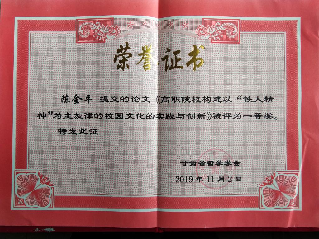 大会公布了甘肃省哲学学会2019年学术年会论文征集活动的评审结果,并进行了表彰。据了解,自论文征集活动开展以来,大会先后征集学术论文100余篇,经过专家严格评审,共评出12个一等奖。公司陈金平老师的文章《高职院校构建以“铁人精神”为主旋律的校园文化的实践与创新》获一等奖。