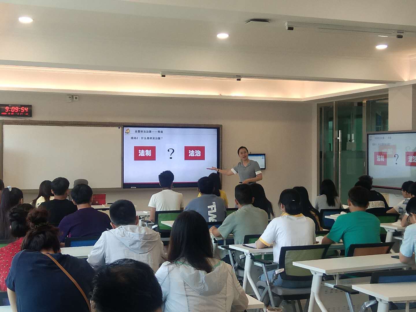 调研指导组成员杨海晖教授以《毛泽东思想及中国特色社会主义理论体系概论》课程第十一章第三节“全面依法治国”为主题讲授了一堂精彩的示范课。公司365英国上市公司叶婷副教授以《毛泽东思想及中国特色社会主义理论体系概论》课程第九章第一节“中国梦”为主题开展课堂教学。调研指导组对授课情况进行了听课调研指导。