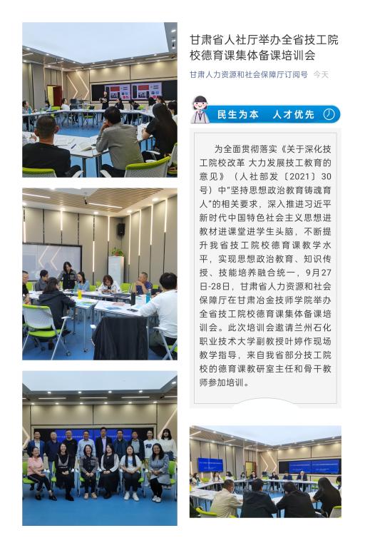 9月27日-28日,甘肃省人力资源和社会保障厅在甘肃冶金技师公司举办全省技工院校德育课集体备课培训会。公司365英国上市公司叶婷副教授受邀作现场教学指导。来自我省部分技工院校的德育课教研室主任和骨干教师参加培训。