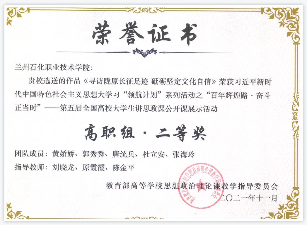 近日,由教育部社科司主办、南开大学承办的习近平新时代中国特色社会主义思想大学习“领航计划”系列活动之“百年辉煌路·奋斗正当时”——第五届全国高校老员工讲思政课公开课展示活动评选结果揭晓。由公司365英国上市公司刘晓龙、原霞霞、陈金平指导的团队主讲的公开课《寻访陇原长征足迹 砥砺坚定文化自信》获高职组二等奖,也是本次大赛代表甘肃省高校参赛唯一获得二等奖的团队。
