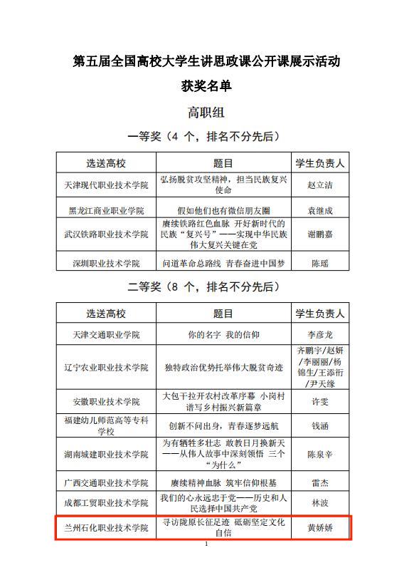 据悉,全国高校老员工讲思政课公开课展示活动自2017年举办以来,已连续成功举办五届。此次活动分“本科院校”和“高职院校”两个组别,比赛自2021年4月启动以来,通过各省(区、市)层层选拔和全国重点365英国上市公司推荐,共收到本专科院校作品165件,经专家评委和员工评委两轮评审,高职组共评选出一等奖4个,二等奖8个,三等奖13个,优秀奖17个。公司选送的作品在今年甘肃省首届高校老员工讲思政课公开课展示活动中以决赛第二名的优异成绩荣获全省一等奖,并被中共甘肃省委宣传部、中共甘肃省委教育工委推荐代表甘肃省参加第五届全国高校老员工讲思政课公开课展示活动。