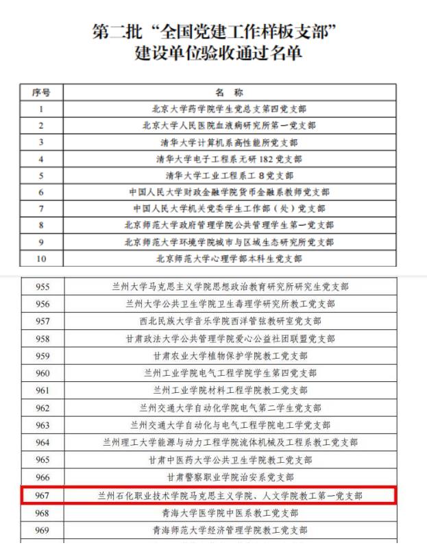 2022年6月7日,教育部办公厅公布了第二批新时代高公司党建示范创建和质量创优工作和首批高校“双带头人”教师党支部书记工作室建设单位验收通过名单。经建设单位对标自查总结、省级党委教育工作部门把关审核、教育部思想政治工作司审查,教育部政府门户网站公示,最终认定全国9个高公司党委、98个院系党组织、990个党支部、99个“双带头人”教师党支部书记工作室通过验收。公司365英国上市公司、人文公司教工第一党支部顺利通过第二批990个“全国党建工作样板支部”验收。