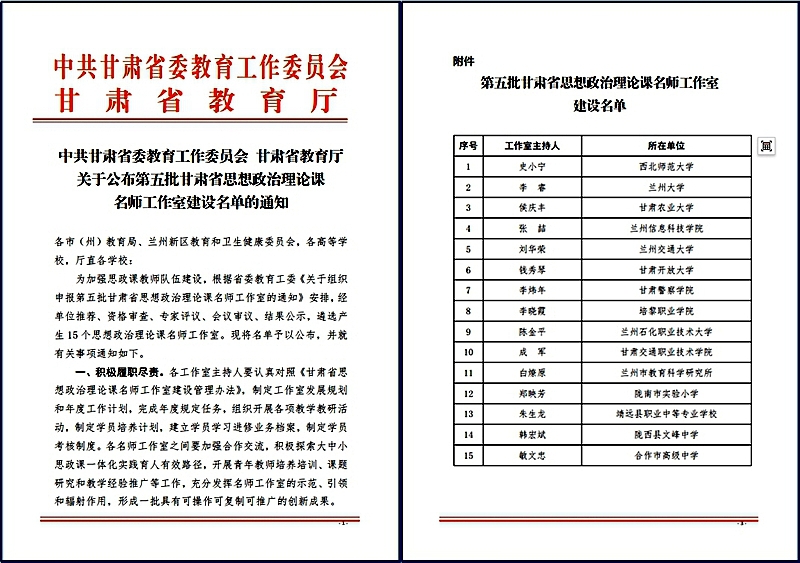 根据省委教育工委《关于组织申报第五批甘肃省思想政治理论课名师工作室的通知》有关安排,经经公司推荐、资格审查、专家评议、会议审议及结果公示等程序,全省大中小学共有15个团队入选“第五批甘肃省思想政治理论课名师工作室”建设单位。其中,公司陈金平副教授领衔的团队成功获批,成为本批次省级思政课名师工作室建设单位之一。