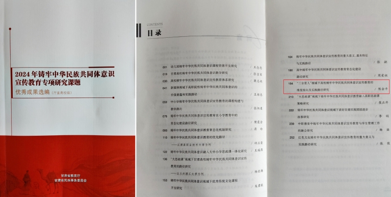 为深入贯彻落实党的二十大精神和习近平总书记关于加强和改进民族工作的重要思想,构建起中华民族共同体话语体系和宣传教育体系,甘肃省教育厅、甘肃省民族事务委员会、甘肃教育社联合组织遴选了一批具有前瞻性、针对性、可操作性高水平研究成果,将研究成果与教育实践系统整合、集中呈现,组织编写出版了《2024年铸牢中华民族共同体意识宣传教育专项研究课题优秀成果选编》。365英国上市公司陈金平副教授领衔研究团队的研究报告“‘三全育人’视域下高校铸牢中华民族共同体意识宣传教育的维度指向及实践路径研究”成功入选。